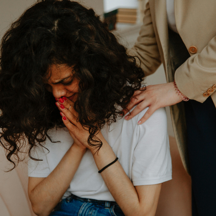 person showing signs of grief and therapist consoling her with a hand on the shoulder